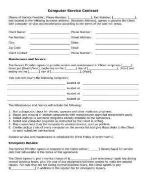 Service contracts such as a computer service contract plays an important role in a business transaction as it documents the agreement that took place add terms and conditions or sections in your contract that are applicable to your way of doing business.